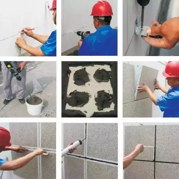 施工準備→基面處理→分格設計與彈線→裁板→安裝底部托架→安裝后置承重支架→粘貼板材→機械固件件加固→嵌縫→分格縫做防水密封與上色→分格縫修繕→整體修繕→竣工驗收。